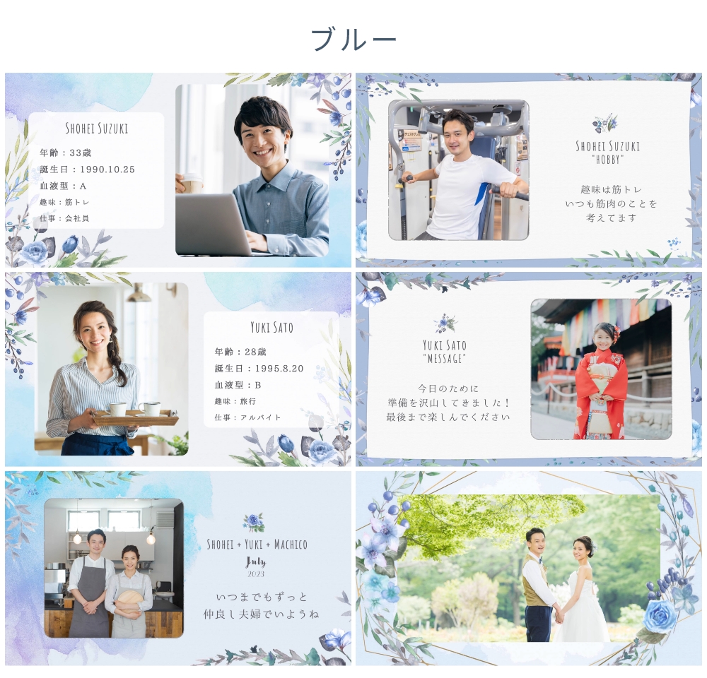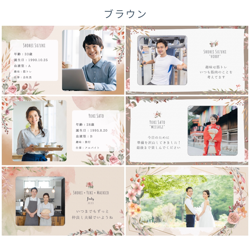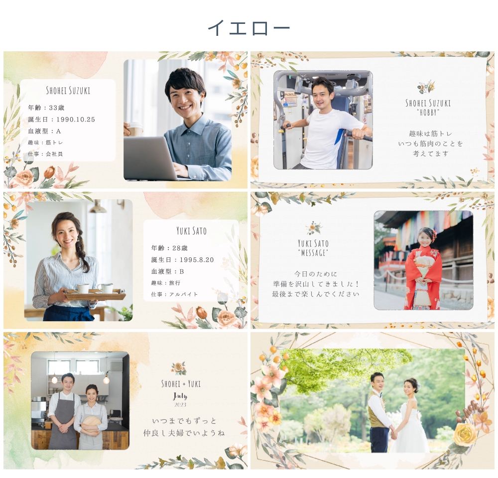 背景や植物のカラーはイエロー / ブルー / ブラウン / ピンク / ホワイト / グリーンの中から選ぶことができます