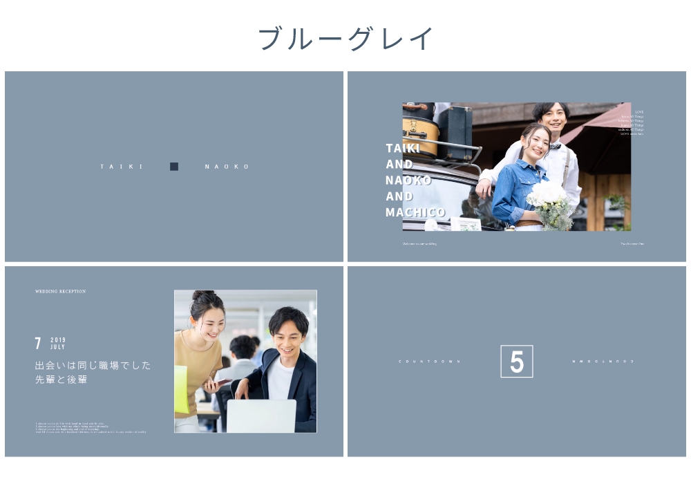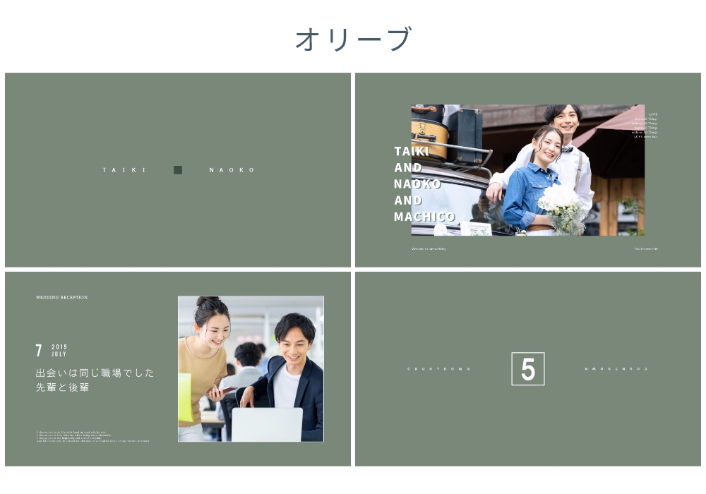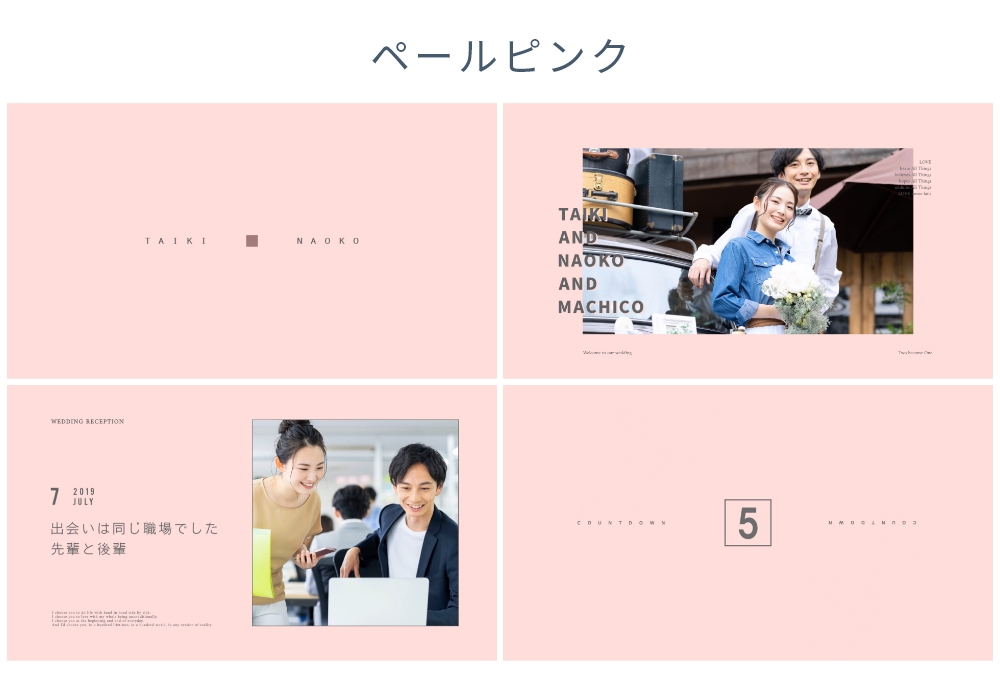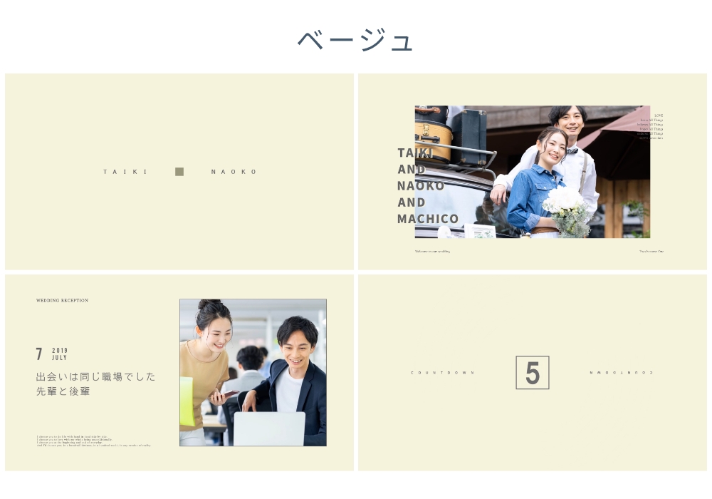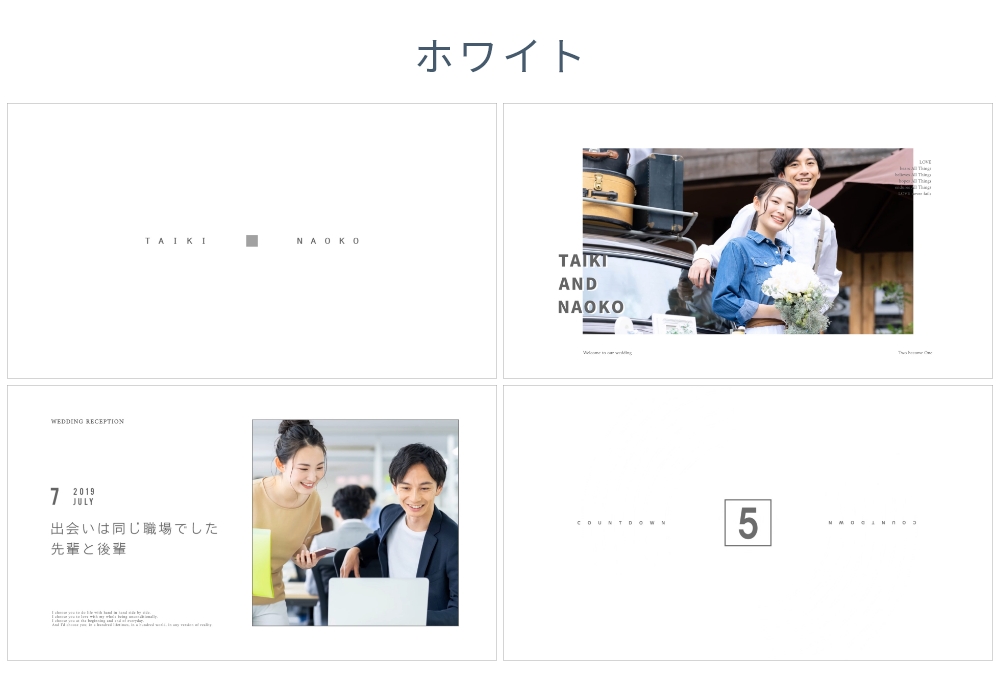 背景や写真の前の装飾が少ないため文字や写真が見やすく、クセのないデザインなので見る人の好き嫌いを問わず幅広いゲストに満足していただけます