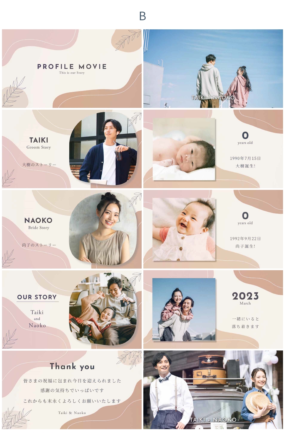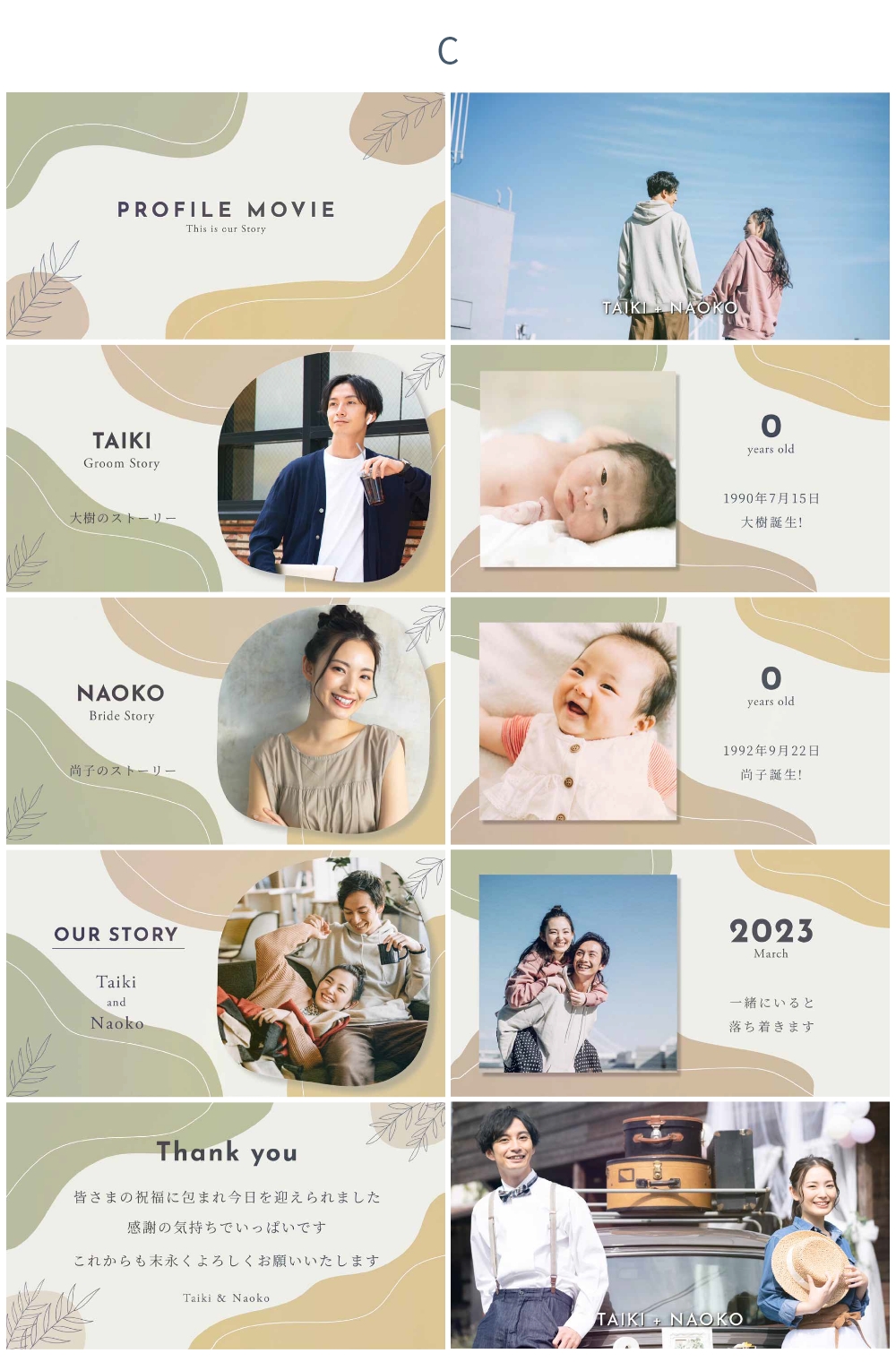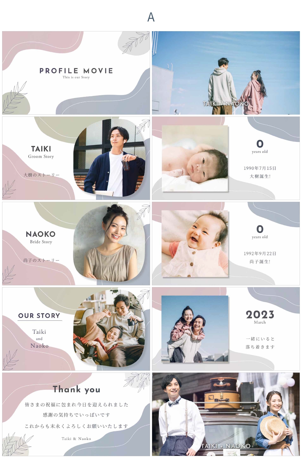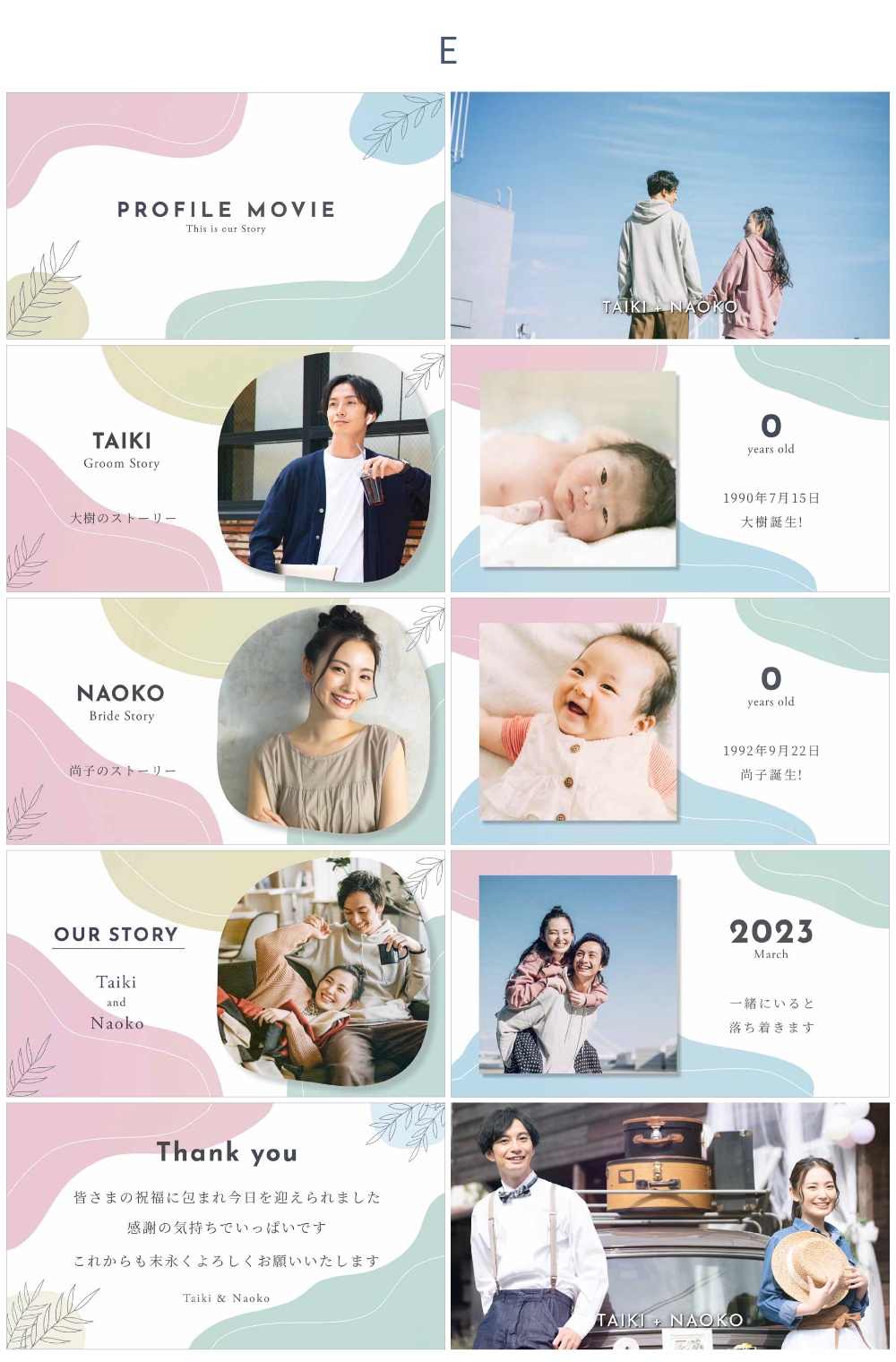 背景色は 新郎パート・新婦パート・おふたりパートそれぞれ A~Eの5種類から選択できます
