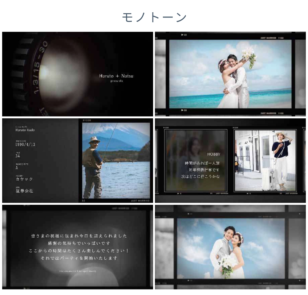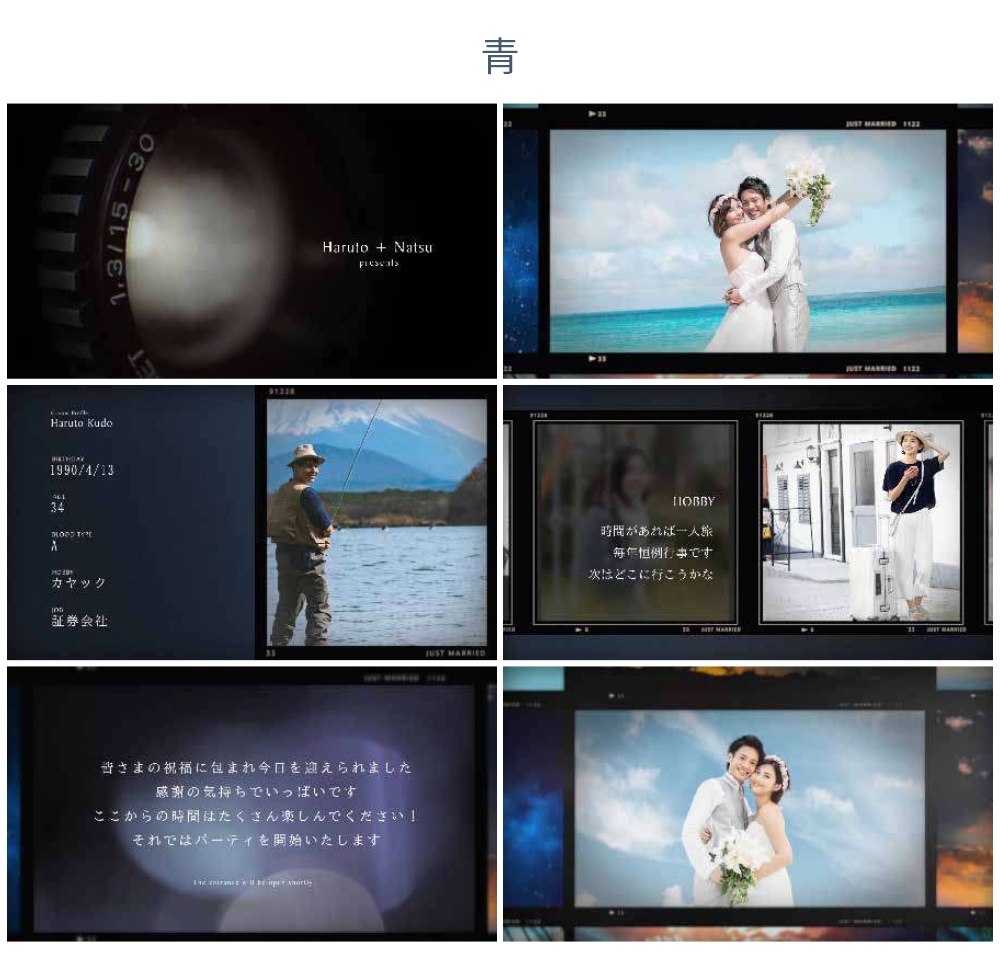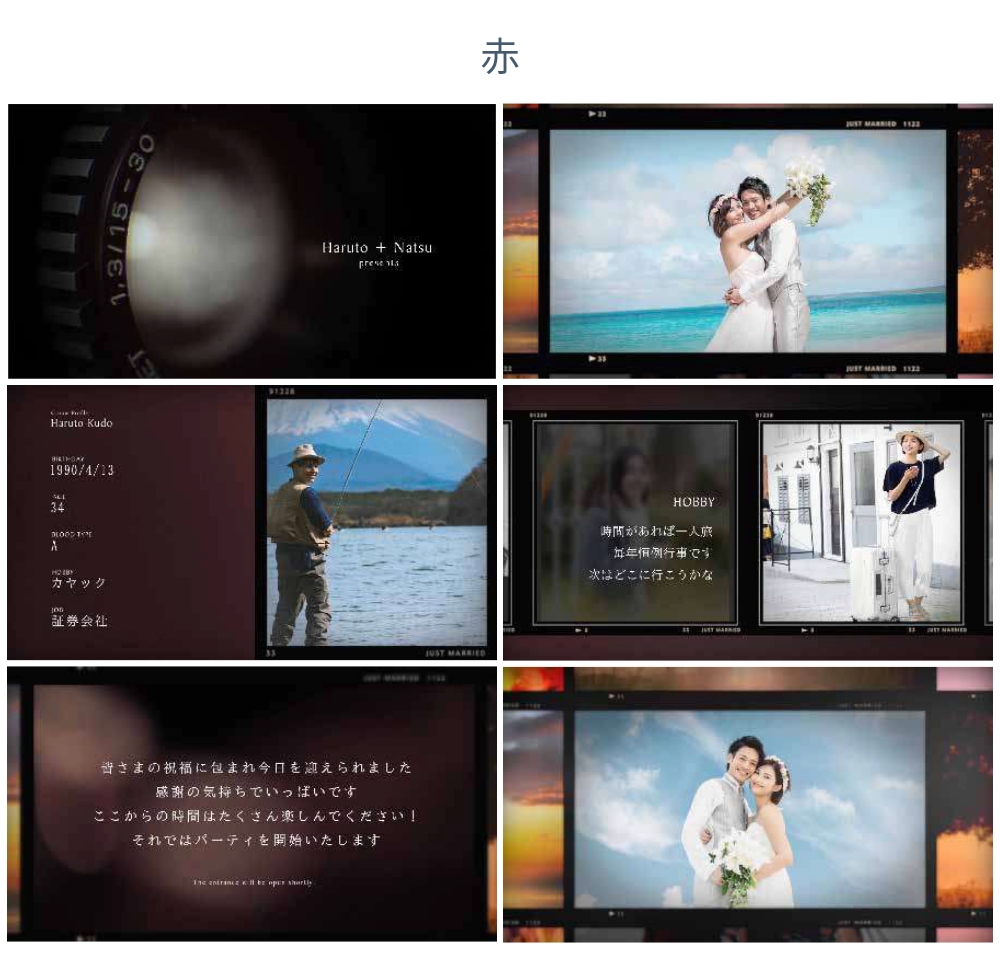 背景色は青 / 赤 / モノトーンの3種類から選択でき、どのカラーを選んでもしっとりとした大人っぽい雰囲気のムービーに仕上がります