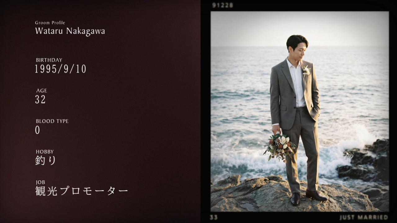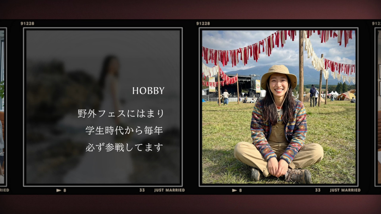 レトロなフィルム枠にお写真をのせ、テキストと一緒におふたりのちょっとした自己紹介や結婚に至るまでのなれそめを紹介することができます