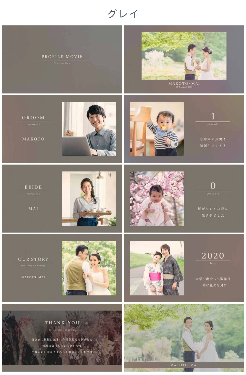 背景カラーは 新郎パート・新婦パート・おふたりパートそれぞれ ホワイト/グレイ/グリーン/ブラウン/の中から選ぶことができます