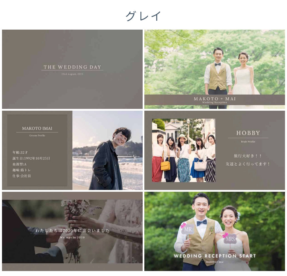 ゲストがおふたりの思い出の写真や文章に集中していただけるよう、背景の装飾をできるかぎり少なくしたデザインになっています